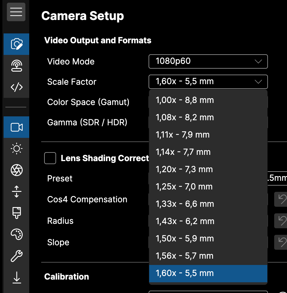 In the software, navigate to Camera Setup > Scale factor.
