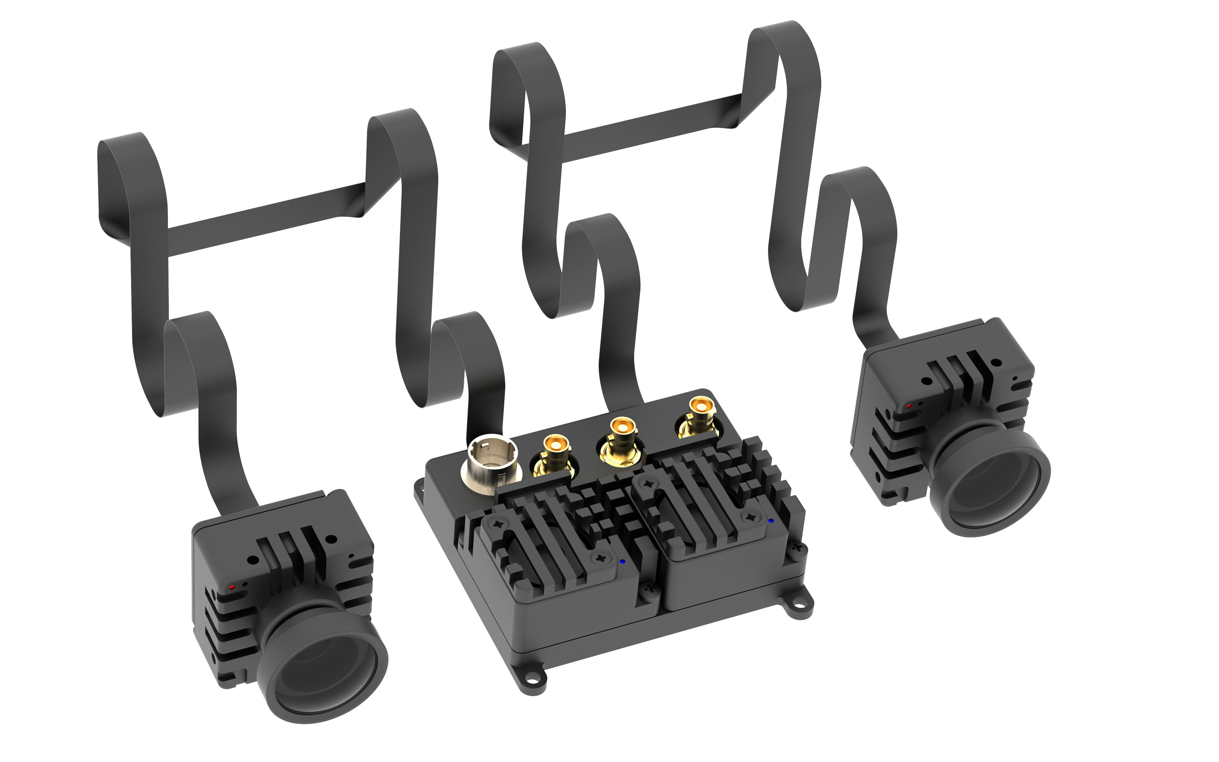 Both camera heads are automatically synchronized by default (Master mode). The SYNC connector allows linking multiple 3D cameras together.
